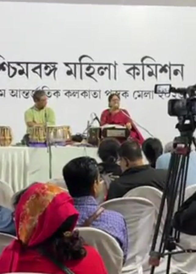 A woman in a red saree is singing in front of a crowd at an event hosted by "পশ্চিমবঙ্গ মহিলা কমিশন" (West Bengal Women's Commission) at the "৪৬ তম আন্তর্জাতিক কলকাতা পুস্তক মেলা ২০২৩" (46th International Kolkata Book Fair 2023)