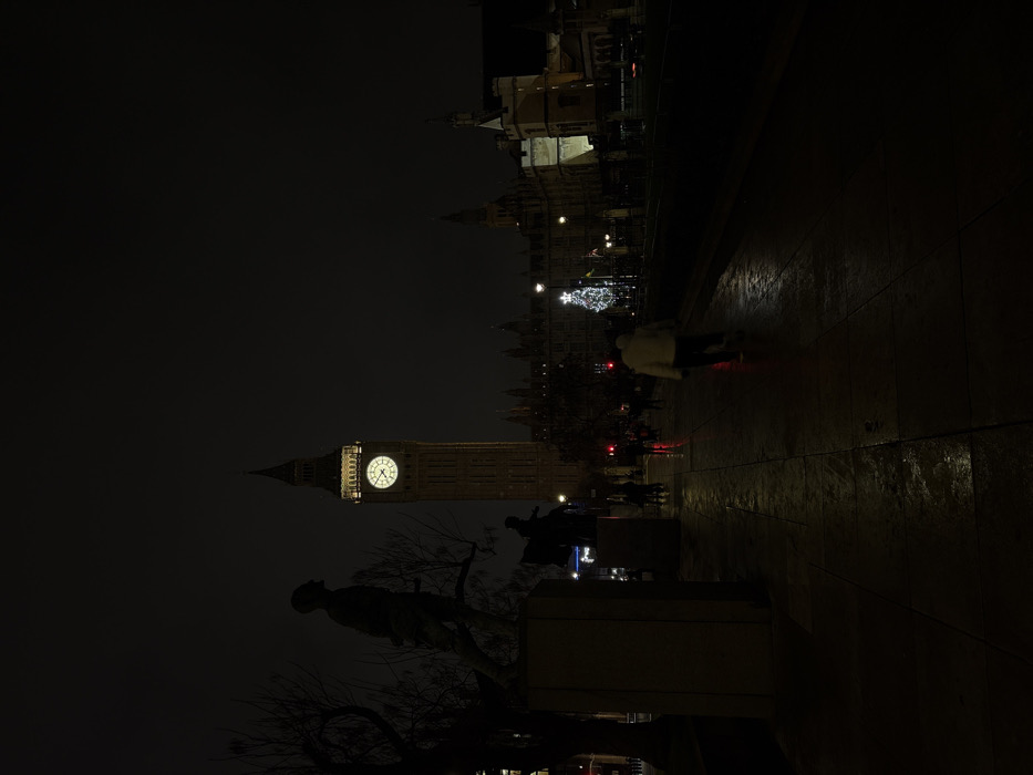 Night view of the Palace of Westminster in London. The illuminated clock face of Big Ben is prominent. A statue stands in the foreground. A walkway is partially illuminated, reflecting light on its surface. People walk along the path. Christmas tree lights are visible further down the street. The buildings in the background are also illuminated. The sky is dark.
