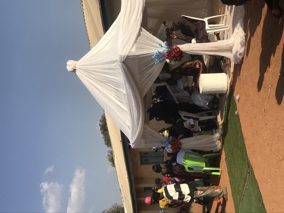 A white canopy adorned with blue and red flowers is set up outdoors. People are seated underneath and around the canopy. Chairs of varying colors, including white and green, are visible. Some individuals are standing near the canopy. A small cylindrical white table is nearby. The sky is visible in the background with the roof of a building. The ground is partially covered in artificial green grass.