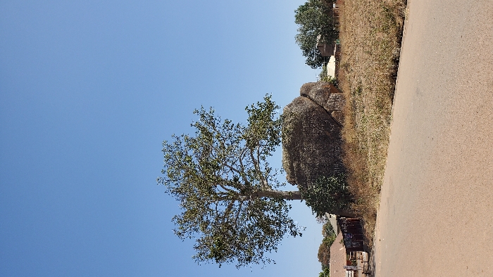 The image captures an outdoor scene in Dutsen Kato, Nigeria, under a clear blue sky. In the mid-ground, a large, deciduous tree with green foliage stands next to a massive, dark-colored boulder that exhibits a prominent vertical fissure. The foreground is occupied by a light brown, unpaved road, which gently curves towards the left. The area immediately adjacent to the road and around the rock is covered with dry, sparse, yellowish-brown vegetation. In the background, multiple structures are discernible; on the left, a building with a reddish-brown roof is partially visible behind a dark fence-like structure, while on the right, additional residential or commercial buildings with varying roof types are present further into the landscape. No individuals, animals, or active events are depicted.