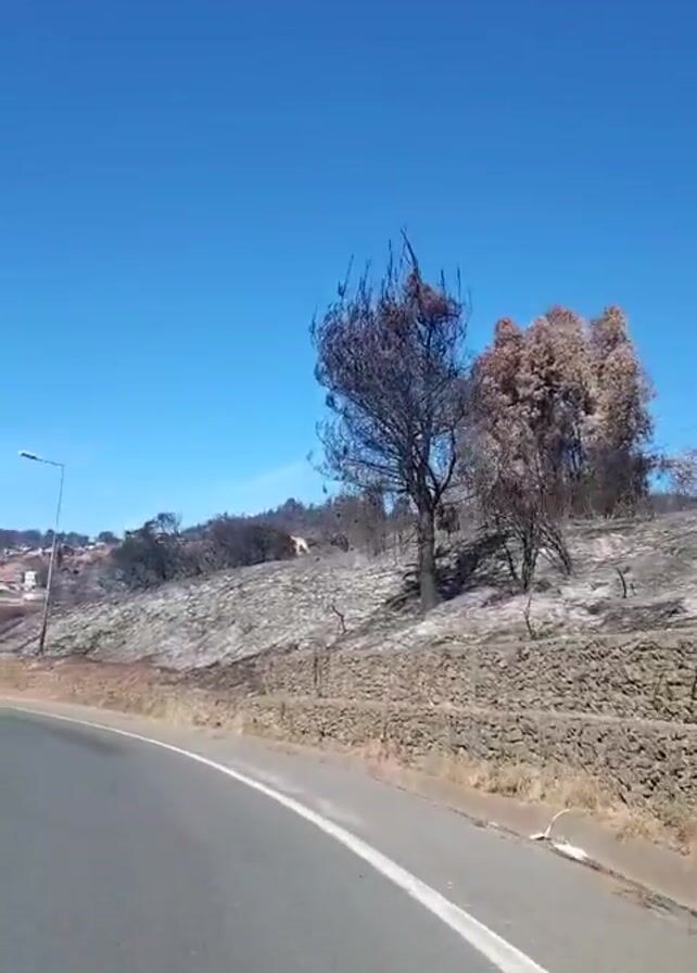 car driving on an asphalt road with a white line separating lanes. On the right side of the road, there's a hillside that has been burned, with charred trees and grey ash covering the ground. A stone retaining wall runs along the base of the hillside, next to the road. As the car drives forward, a street lamp comes into view. In the distance, a small town is visible on the horizon, with buildings clustered together. The sky above is clear and blue. The overall scene depicts the aftermath of a fire in a rural area.