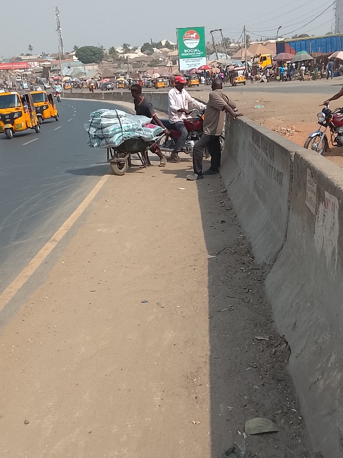 The image depicts a bustling urban street scene during daylight in Masaka, Nigeria. In the immediate foreground, a dark-colored wheelbarrow, heavily laden with multiple light-colored (possibly white or light blue) sacks secured by straps, rests on the edge of an asphalt road and an adjacent dirt shoulder. A dark-skinned male subject, wearing a dark t-shirt and dark trousers, stands behind the wheelbarrow, appearing to push or stabilize it. To his right, a second dark-skinned male subject, wearing a light-colored long-sleeved shirt and a red baseball cap, is seated on a red motorcycle positioned next to the wheelbarrow. Further right, a third dark-skinned male subject, wearing a brown t-shirt and dark trousers, leans with his left arm on a concrete road barrier that delineates the road from a lower dirt embankment. He faces the other two individuals and the wheelbarrow. The asphalt road to the left features a yellow lane divider. Several yellow three-wheeled vehicles (tuk-tuks) are visible on the road, with at least three moving away from the viewer in the left lane. In the mid-ground, beyond the road and barrier, a lively street environment includes market stalls shaded by various colored umbrellas, other vehicles (including a yellow truck), and pedestrians. A prominent green billboard displaying "SOCIAL DEMOCRATIC PARTY" and its "SDP" logo is visible above the market area. In the background, scattered residential and commercial buildings are present under a hazy, light-colored sky. A tall telecommunications mast stands in the upper left background. The ground on the immediate right of the concrete barrier is dirt, exhibiting scattered debris. The scene is illuminated by strong daylight, casting distinct shadows, notably from the concrete barrier onto the dirt embankment.