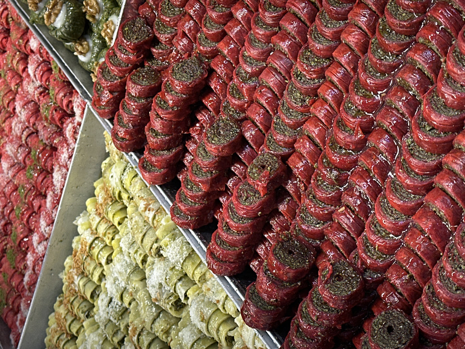 - "Multiple metal trays are filled with rows of assorted Middle Eastern pastries, consistent with baklava and kadaif, displayed for sale" by FM-jqiIm2, licensed under CC BY 4.0