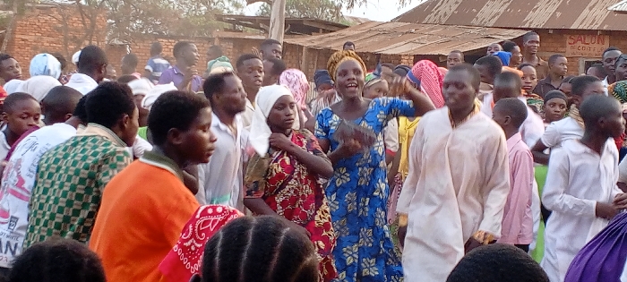 The image depicts a densely packed outdoor public gathering in the city of Fizi, Democratic Republic of the Congo
