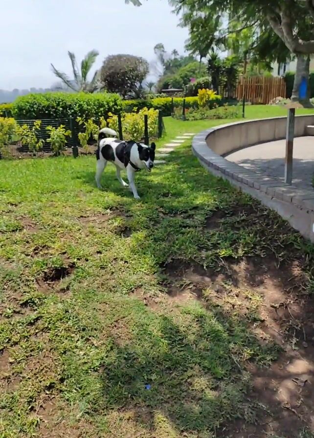 black and white dog running in a grassy area of a park. The dog is wearing a harness and the park is well-maintained with green grass, trees, and a paved walkway. In the background, there are buildings and foliage visible in the distance. The dog stops briefly before continuing to walk away from the camera. The sky is partly cloudy.