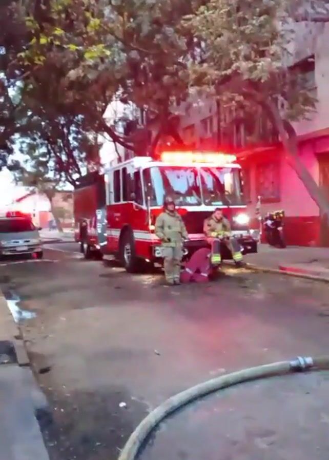 A red and white fire truck is parked on a street with two firefighters standing near it. One firefighter is standing in front of the truck, and the other is kneeling. A fire hose is lying on the street. The fire truck's lights are flashing. The street is lined with trees and buildings. There is a car and a motorcycle parked nearby. There is trash on the street. Sirens can be heard in the background.