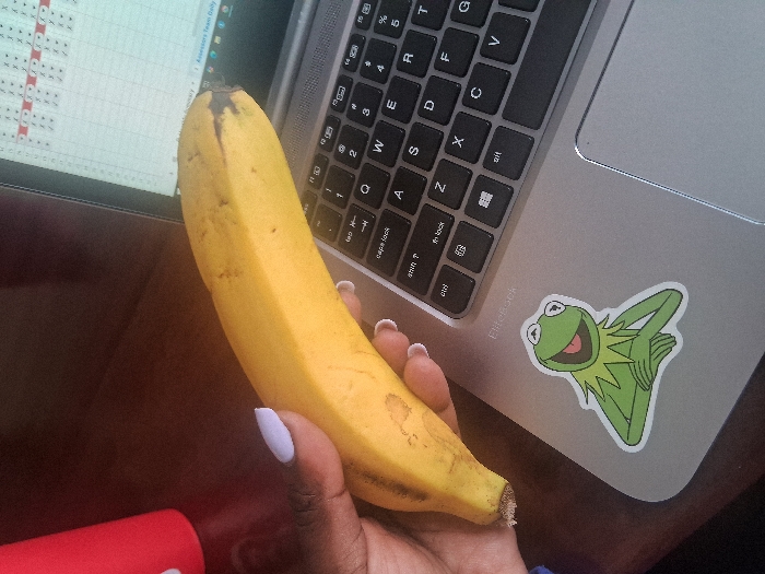 - "The image depicts a close-up, overhead view of a dark-skinned human hand holding a ripe yellow banana over an open silver laptop on a dark brown desk surface" by FM-UrRWw2, licensed under CC BY 4.0