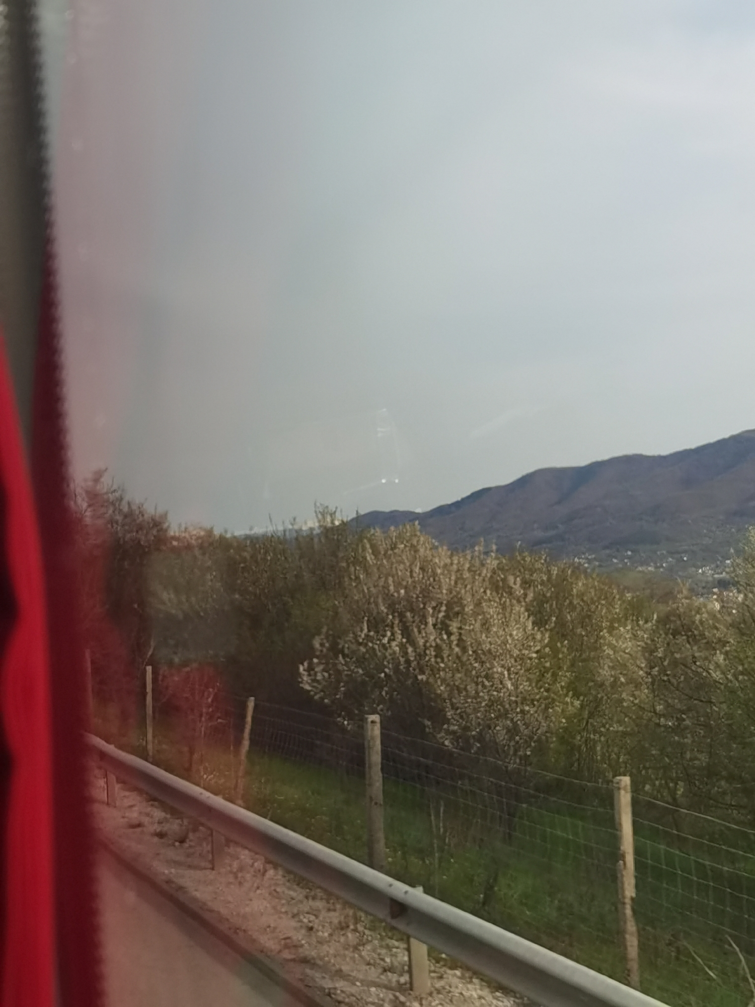 View from a vehicle window, likely a bus, showing a roadside landscape in Pravets, Bulgaria. A metal guardrail runs along the edge of a road, with a wire fence separating the road from a grassy area. Beyond the fence are blooming bushes/small trees. In the background, a mountain range is visible under an overcast sky. No people are visible.