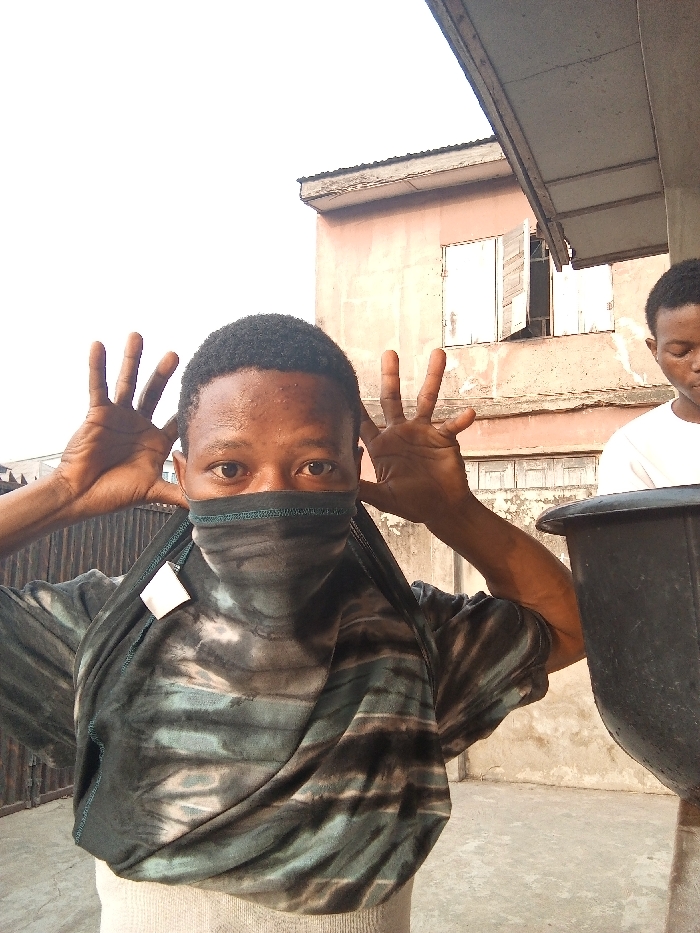 A person with a masked face stands in front of a building, hands held up to their head. The mask is made from the neck of a tie-dye shirt. A white tag is visible on the side of the mask. Another person partially appears to the right with a dark container in the foreground. The background building is two stories with closed white shutters on the windows. The sky is overcast and light gray.