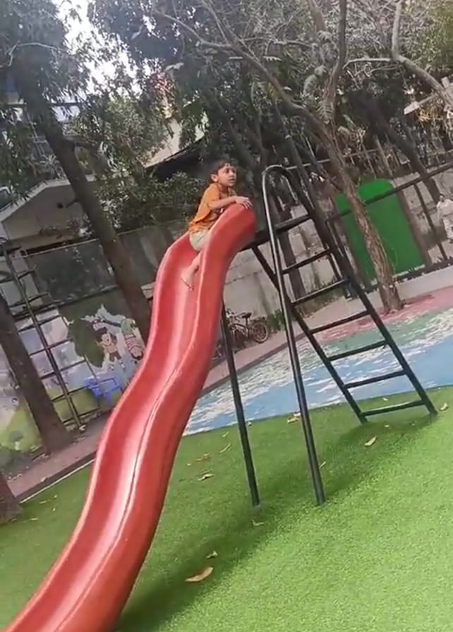 A young boy wearing an orange shirt sits at the top of a red slide at a playground. The slide has black metal support and a ladder. The ground beneath the slide is covered in green artificial turf. In the background there are trees, a fence, and a building. A red bicycle is parked near the fence. The weather is sunny. The camera is still.