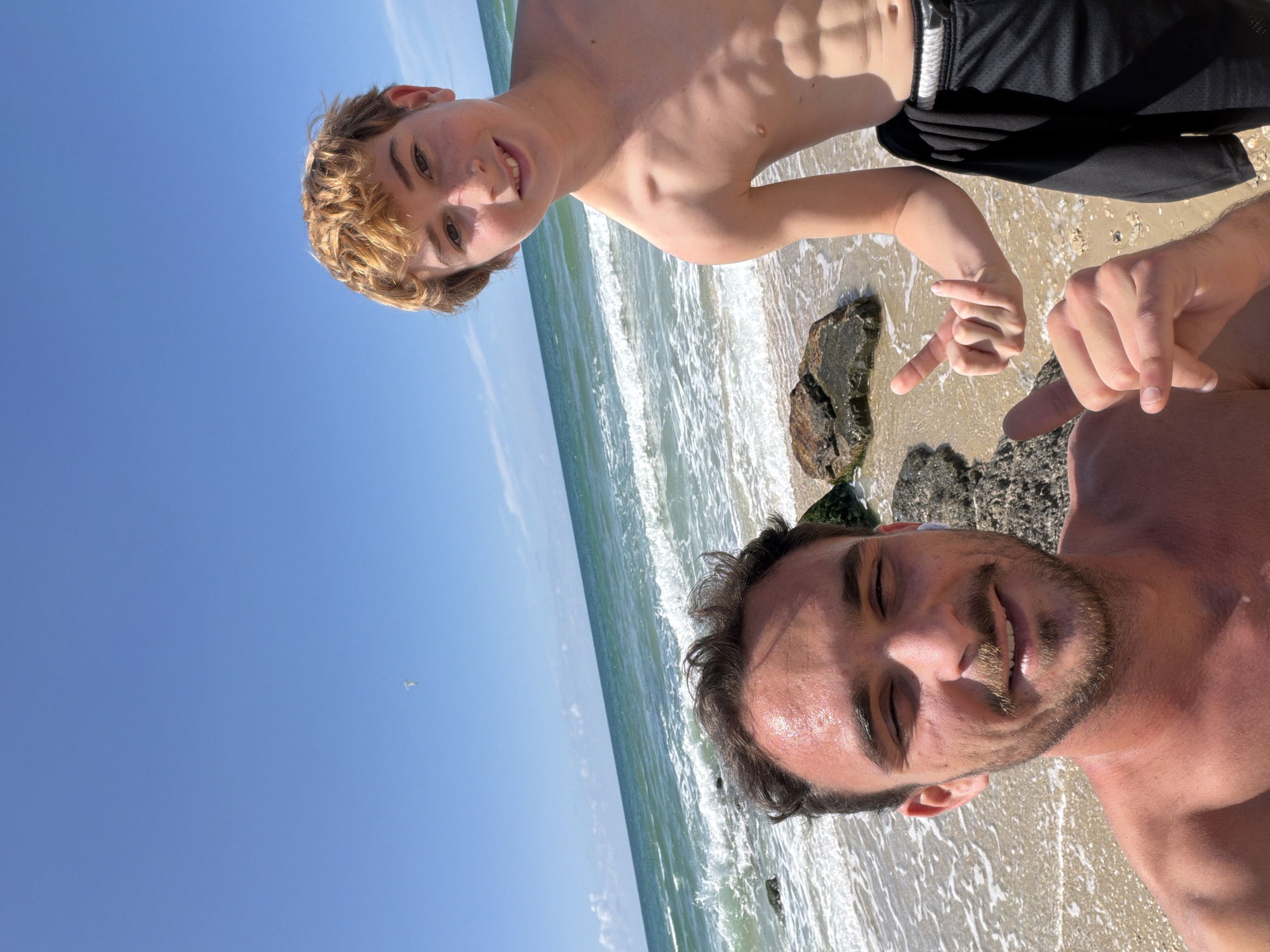 An image captured on a sunny day at a sandy beach in Beit Yanai, Israel, features two shirtless males posing in what appears to be a selfie. The foreground shows an adult male, approximately 20-30 years old, with short dark curly hair, a beard, and a mustache, smiling towards the camera with partially closed eyes. He wears a white earbud in his right ear, and his right hand is visible in the lower left corner making a gesture with his thumb and index finger extended. To his right and slightly behind him stands a younger male, appearing to be a pre-teen or early teenager, with light brown curly hair, also smiling towards the camera. He is wearing black mesh shorts with a white waistband and has his right hand raised, giving a thumbs-up gesture. The background consists of the Mediterranean Sea with moderate turquoise waves breaking on the shore, which is composed of light brown sand and dark, algae-covered rocks. The sky is clear and bright blue, with minimal high-altitude cloud formations. A small white kite or similar airborne object is visible high in the sky in the upper left portion of the frame.