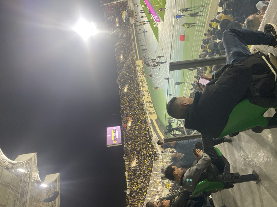 This image depicts the Grand Stade de Fès (Fez Stadium) in Fez, Morocco, at night during an event. The perspective is from an elevated seating section, looking down onto a stadium track and playing field, and across to the opposite stands. In the immediate foreground, two male spectators are seated in green stadium seats. The man closer to the camera, positioned on the right, wears a dark jacket and blue jeans, holding and observing a smartphone with both hands. To his left, another male spectator, dressed in a grey long-sleeved top and dark pants, is also engrossed in a smartphone. A clear, possibly glass, barrier separates these foreground seats from the lower levels of the stadium. Beyond the barrier, a blue running track with white lanes encircles a green playing field. Numerous individuals, primarily appearing as event staff or security personnel in dark attire, are distributed across the track and at the field's edge. A prominent banner or painted message, visible on the wall separating the track from the lower stands, displays "WE ARE YOUR HUCKLEBERRY" in yellow text on a dark background. The far stadium stands are densely populated with a large crowd of spectators, predominantly dressed in yellow clothing. Above these stands, a large video scoreboard is visible, displaying what appears to be a score (0-0 or similar) and two team logos, one red and white, the other a multi-colored shield. The stadium is brightly illuminated by powerful floodlights, with one particularly intense light source flaring prominently on the right side of the image. Overhead stadium infrastructure, including metal trusses and large speakers, is visible against the dark night sky.