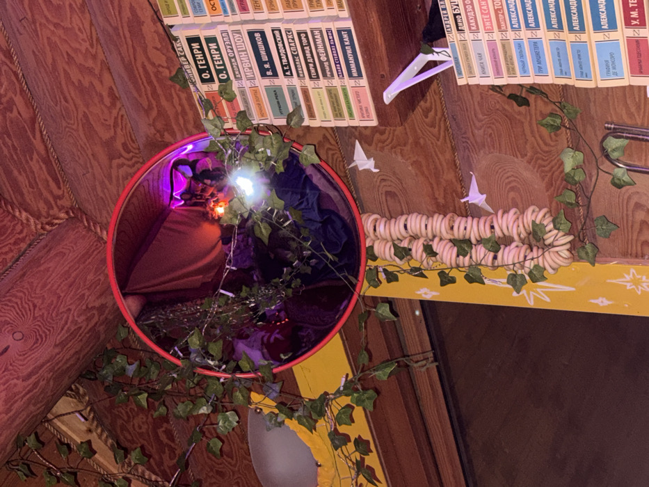 The image features a red-framed round mirror reflecting a room with a warm color scheme. The mirror is adorned with artificial ivy, and the space includes a bookshelf with books by authors such as O. Henry, George Orwell, and Irwin Shaw. A string of bagels and origami paper cranes are also visible. The overall aesthetic is cozy and somewhat whimsical, with elements of literature and nature.