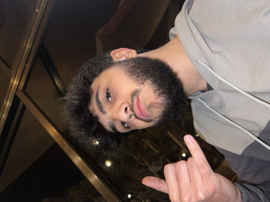 A young man with dark hair and a beard poses, seemingly indoors. He is angled downward, looking at the camera with dark eyes. He wears a grey hoodie. His right hand is visible in the lower right, fingers shaped to make a "rock on" gesture. A window or reflective surface is visible behind him, with hints of a dark or dimly lit interior. The lighting appears soft and warm.