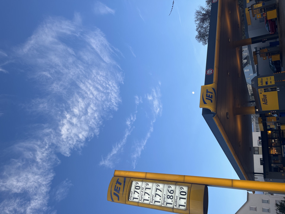 A JET gas station displays fuel prices under a bright blue sky with scattered clouds