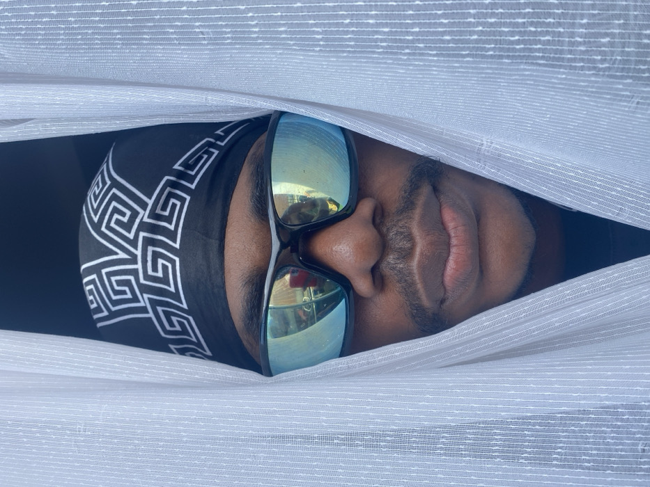In Igboefon, Nigeria, a close-up, head-on forensic image depicts an adult male partially framed by two white, translucent curtains. The subject has dark skin and wears a black bandana featuring a repeating white geometric Greek key pattern on his head. He is equipped with black-framed sunglasses that possess highly reflective blue-green mirrored lenses; these lenses show reflections of an indoor environment, including what appears to be a red object. A mustache and a small goatee are visible on the subject's face. The curtains, textured with vertical lines, are positioned on either side of the subject's face, with a dark, indistinct area visible behind his head. The individual maintains a neutral facial expression, looking directly forward.
