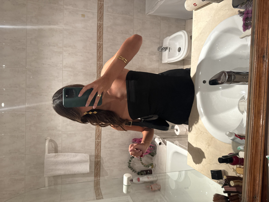 A woman takes a selfie in a bathroom. She wears a strapless black dress, gold bracelets, and statement earrings. Her long brown hair is styled in loose waves. In the foreground, a white sink with a marble countertop holds toiletries. A bidet is visible in the background against a tiled wall. A towel hangs on a bar next to the mirror.