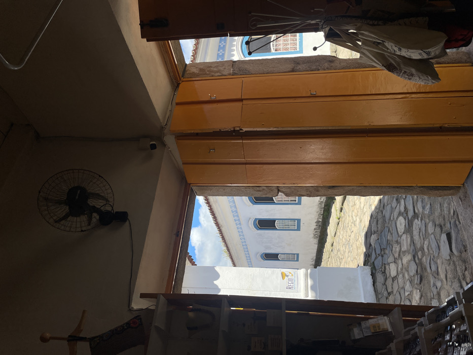 The image depicts a view from a dimly lit interior looking outward through an open stone doorway onto a sunlit cobblestone street in the city of Paraty, Brazil. Inside the interior space, on the upper left wall, a black wall-mounted electric fan is visible, with associated wiring running beneath it. To the right, a small white security camera is affixed to a ceiling beam. On the far left, shelves containing merchandise are partially visible, alongside a wooden display stand holding a woven item. On the far right, a dark wooden door frame is seen, with a metal coat rack holding several light-colored fabric tote bags. The doorway itself is framed by rough-hewn stone masonry. Two tall, narrow, yellow wooden bifold shutters are partially open and folded back into the doorway's framework, displaying their vertical paneling and small metal latches. Beyond the doorway, the exterior scene shows a cobblestone street, brightly illuminated by sunlight. On the left side of the street, a white colonial-style building with a red-tiled roof features a yellow sign bearing the word "REGIO" and a stylized icon. On the right, another white colonial-style building with a red-tiled roof exhibits blue trim around its windows, which have white grates, and a decorative blue and white patterned frieze below the roofline. A clear blue sky with scattered white clouds is visible above the buildings. No individuals are present in the scene.