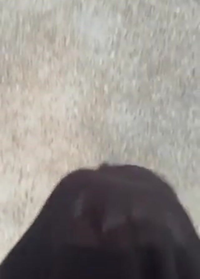 first-person perspective of someone walking on a concrete surface. The person is wearing a long, black, semi-transparent garment and brown boots. The camera view is mostly focused on the garment and the ground as the person walks. A white object and a red-tipped object are briefly visible on the ground in the lower right corner of the frame.