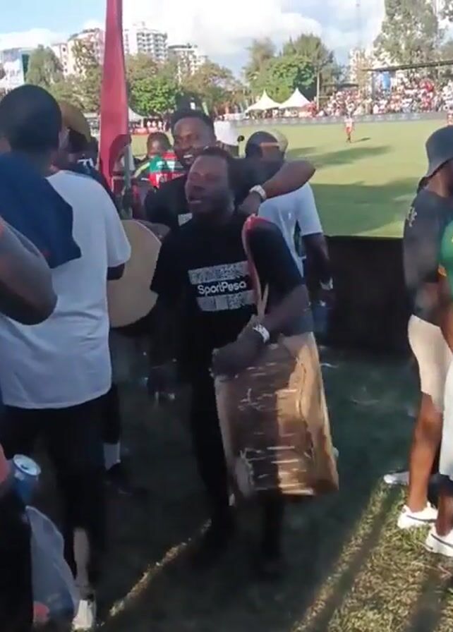 A group of people are gathered around two drummers who are playing and singing enthusiastically. The drummers are standing in front, with their drums held in front of them. They are surrounded by other people who are cheering and singing along. A flag is visible behind the group, and a sports field with spectators in the background. The setting appears to be an outdoor event, possibly a sports game or festival.
