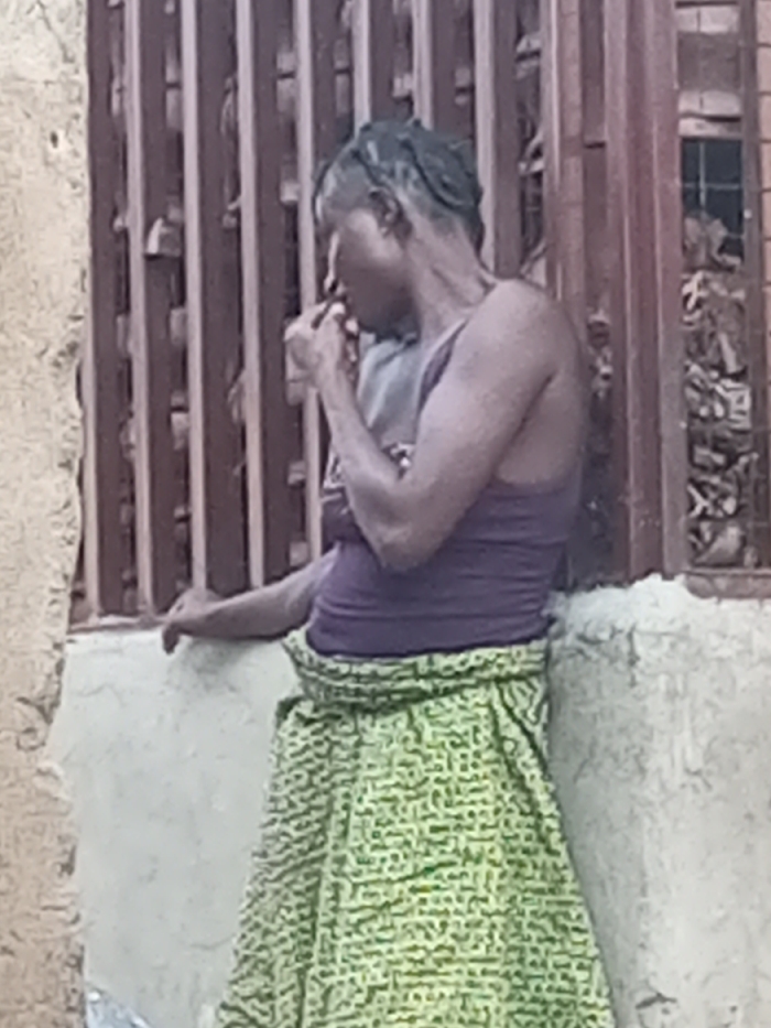 A single adult individual, an adult female, is depicted leaning against a light-colored concrete or stucco wall in Zango-ndaji, Nigeria