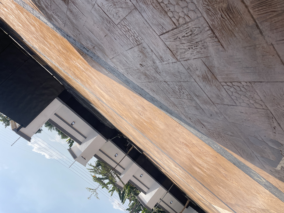 The scene depicts an exterior ground-level view of a property entrance or driveway in Ogbunu, Nigeria. The ground surface is paved with stamped concrete, featuring two distinct sections. The left and upper portion of the paving is a reddish-brown color with a textured finish. The right and lower portion is grayish-brown, imprinted with multiple patterns resembling wood grain and scale-like textures. A thin, dark grey strip runs diagonally, separating these two paved areas. In the background, a white perimeter wall with dark grey accents is visible, featuring several integrated rectangular light fixtures. Above the wall, green foliage from trees and shrubs is present, along with multiple parallel wires, indicative of utility or security infrastructure. A large, dark-colored gate is partially visible behind the wall on the right side. The sky above is clear blue with sparse white clouds. The lighting suggests a bright, sunny day, with shadows cast across the paved surface. No individuals, actions, or interactions are observed in the frame.