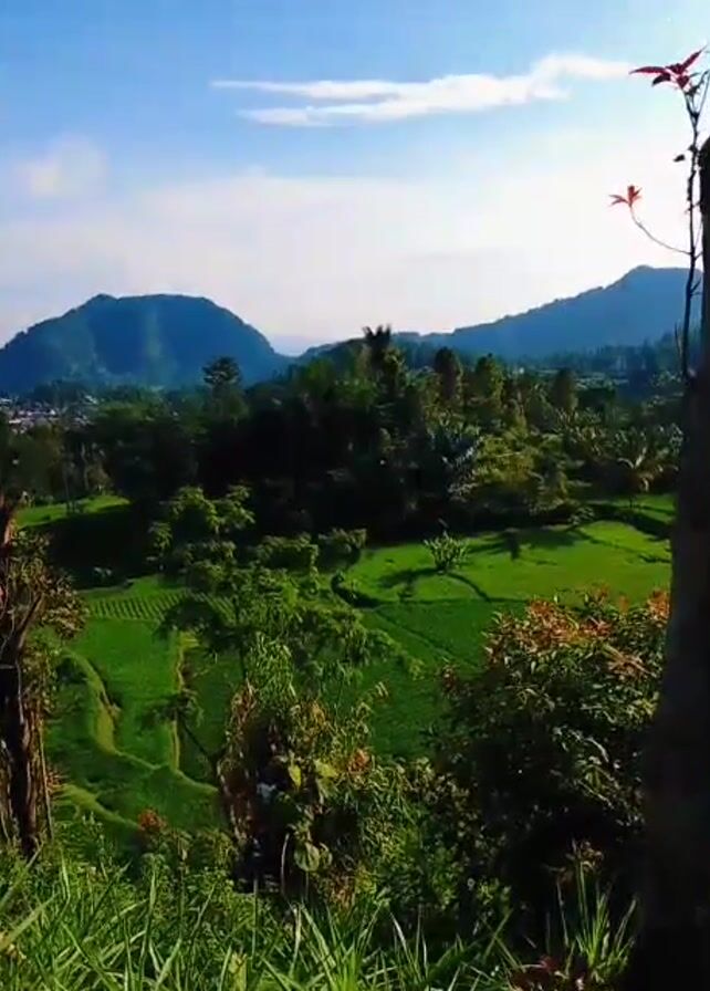landscape of rice terraces and lush greenery. The scene is shot from an elevated position, looking out over the valley. There are mountains in the background under a clear blue sky with scattered clouds. In the foreground are tall grasses and trees. A thin tree trunk frames the right side of the view. The light is bright, suggesting it is daytime.