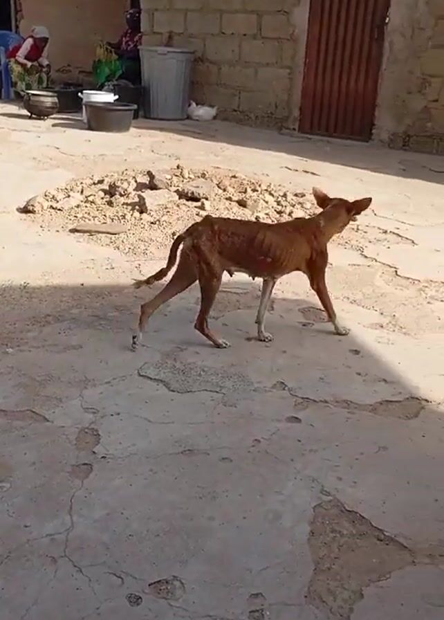 severely emaciated dog walking across a cracked, light-colored paved surface. In the background are buildings constructed of brick and mud. A black plastic bucket sits near a brick wall. Two people are seated near the entrance to one of the mud buildings. A white chicken stands near a brick wall. The dog continues walking in the sun, and its shadow is visible.