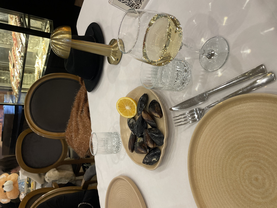 A table setting features a plate of mussels with a lemon wedge, a large dinner plate, and cutlery. Two water glasses and a wine glass containing white wine are present. A black hat sits beside a decorative gold object. The table is white, and a glimpse of a restaurant interior with tables and chairs is visible in the background.