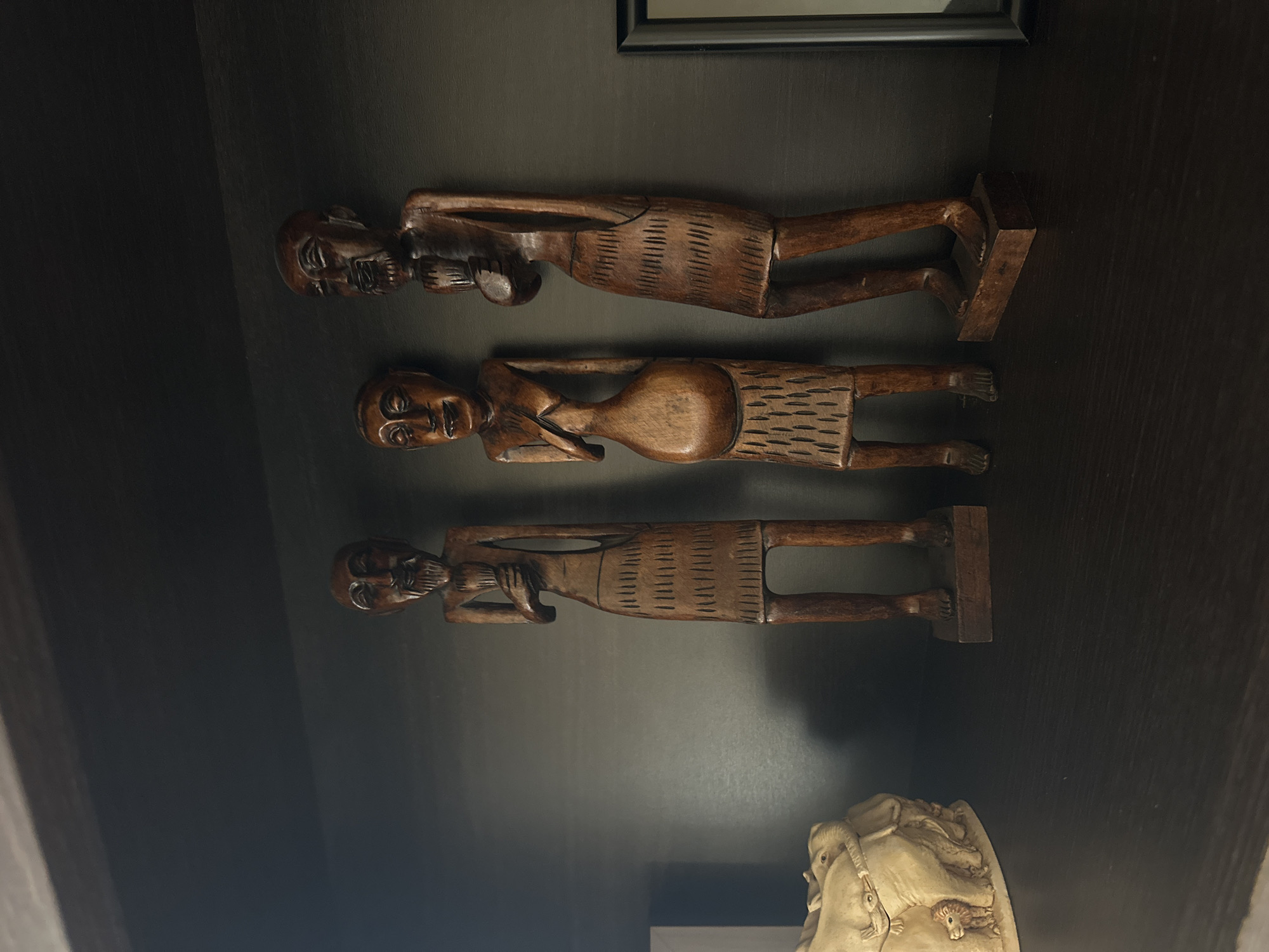 three wooden figurines of human-like figures, likely African in style