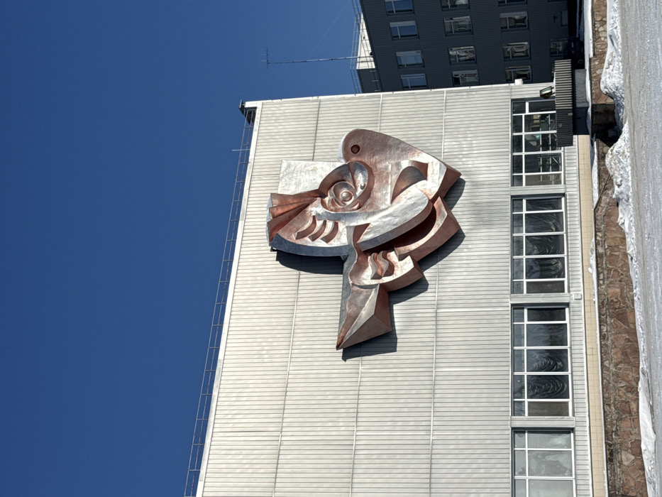 The image depicts the exterior of the Palace of Culture Energetik in Pryp'yat', Ukraine. The building features a multi-story facade clad in vertical light-gray paneling, illuminated by direct sunlight under a clear blue sky. A large, three-dimensional bas-relief sculpture is centrally mounted on the upper facade. This sculpture is composed of abstract, geometric, and curvilinear metallic elements, exhibiting tones of oxidized copper and silver, depicting a stylized bird or dove figure. Sunlight from the right casts a distinct shadow of the artwork onto the building surface. Below the sculpture, a continuous row of uniform ground-floor windows with white frames extends across the facade; the interiors visible through these windows appear darkened. The base of the building is defined by a low retaining wall constructed of reddish-brown, textured stone. The ground surface in the foreground displays patches of snow intermingled with exposed earth. To the right of the primary building, a secondary, taller structure with multiple dark-framed windows is partially visible. An antenna projects into the clear blue sky between the two buildings. No human figures or active subjects are present in the scene.