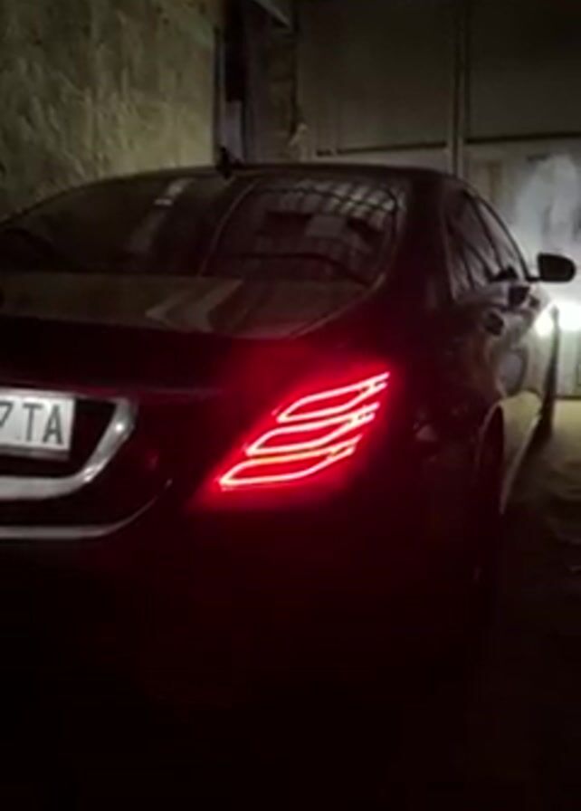 A black Mercedes-Benz sedan is parked in a dimly lit garage. The car's taillights are illuminated, and the license plate reads "347 TA." The garage has a metal door and concrete walls. The car is stationary, and the engine is idling. There are no people visible in the frame.
