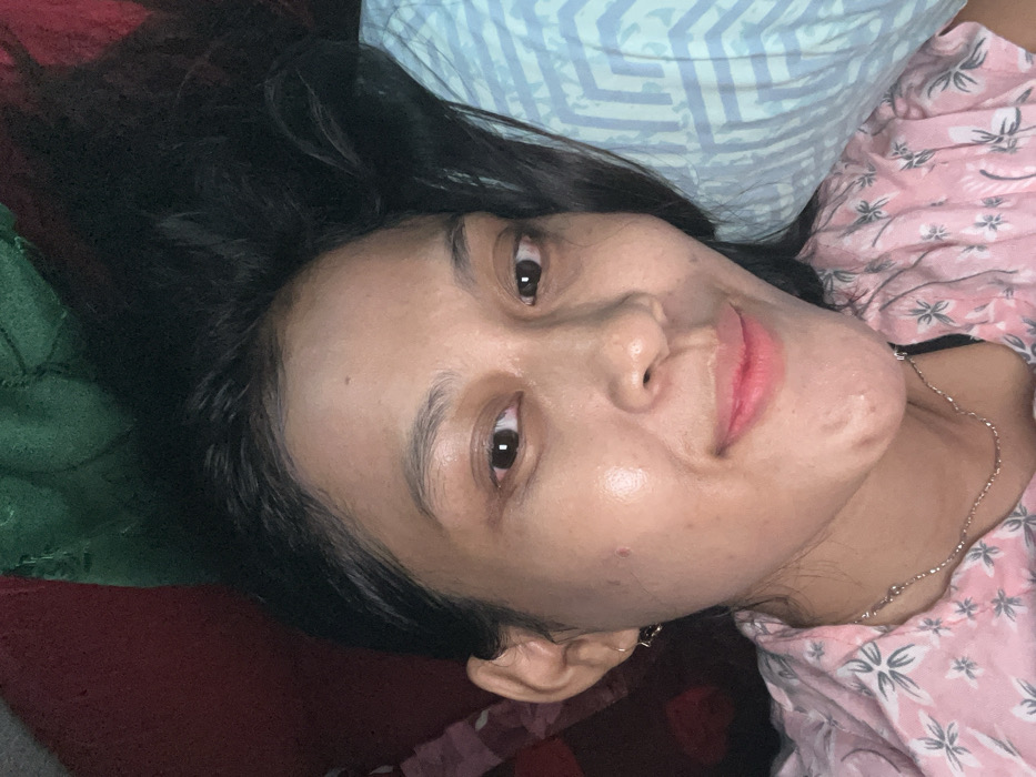 The image displays a close-up, eye-level portrait of an adult female, positioned horizontally, in what appears to be an indoor setting within the city of Kecamatan Pati, Indonesia. The individual, of East Asian or Southeast Asian descent, looks directly at the camera with a slight smile. Her face is central, displaying a light complexion with minor blemishes on the left cheek and chin, and a visible pink lip tint. Dark hair is visible around her head. She wears a pink short-sleeved top with a white floral pattern, a thin silver-colored chain necklace, and a small gold-colored hoop earring on her left earlobe. She is resting on a light blue and white geometrically patterned pillow, visible to the right of her head. To the upper left, a dark red fabric is present, and to the upper right, a dark green fabric, consistent with bedding materials.