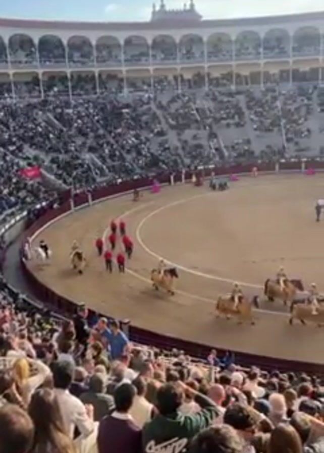 The video captures a vibrant bullfight event held in a packed stadium