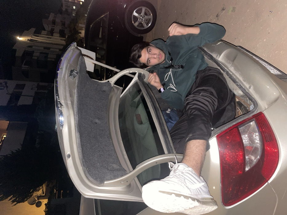 - "A young male is partially situated inside the open trunk of a light-beige sedan at night" by FM-okz7B2, licensed under CC BY 4.0