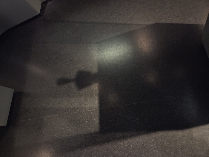 Dark-toned flooring dominates the view, presenting a textured surface. The scene is illuminated by a light source, casting shadows. A notable shadow appears, resembling a vacuum cleaner or similar object, adding depth to the visual. The top left corner shows a section of the wall.