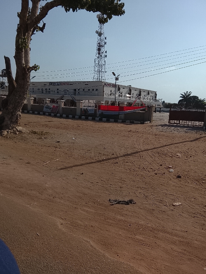 The scene depicts an outdoor environment in Wukari, Nigeria, under clear daylight conditions. In the foreground, a reddish-brown dirt surface, showing tire tracks and scattered debris, extends across the lower half of the frame. A large, gnarled tree trunk with sparse green foliage partially obscures the left side of the image. The midground features a two-story building labeled "ELIZABETH CENTRE" with a white facade and an accessible upper-level balcony featuring white railings. Several rectangular signs are affixed to a low, striped black and white barrier in front of the building. A large red banner or tarp is stretched horizontally across a section of the area directly in front of the building. To the right, an open brown metal gate provides access to a paved area. A tall, metallic communications tower rises prominently behind and to the left of the "ELIZABETH CENTRE" building, extending high into the clear, light blue sky. Overhead power lines or communication cables traverse the upper midground. In the background, palm trees are visible to the right. No individuals are present or depicted engaging in any actions.