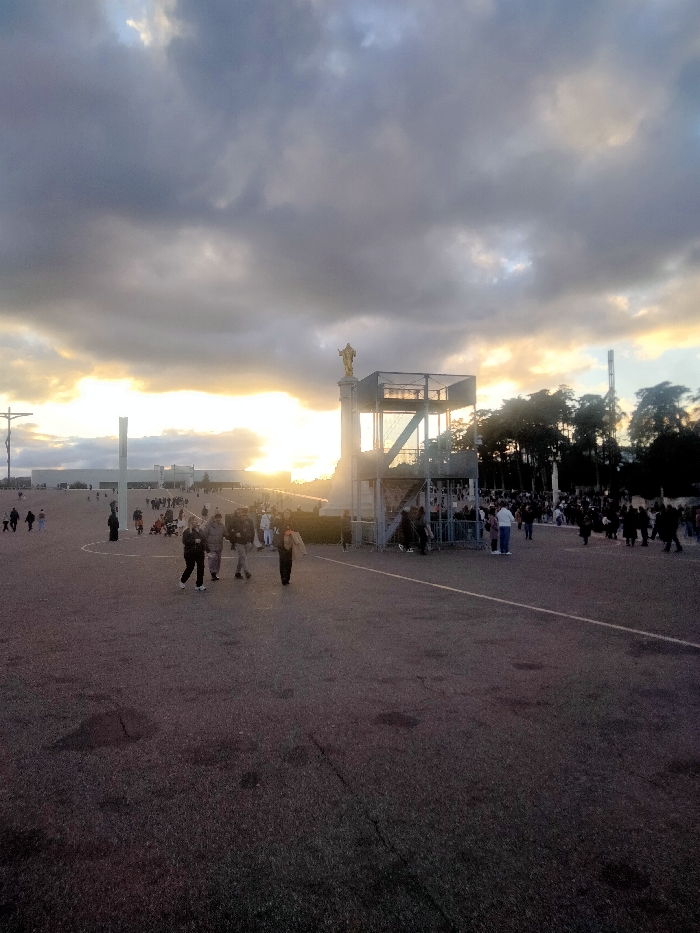 The image presents a wide-angle view of a vast, paved outdoor plaza within the Sanctuary of Fátima, Portugal, under an overcast sky during late afternoon or early evening. A low sun breaks through the clouds on the horizon, creating a bright, warm backlight that silhouettes many elements and casts long shadows. In the left mid-ground, a tall, dark concrete crucifix with a minimalist design stands prominently. Further to the left and in the background, a long, white, modern building, likely part of the Sanctuary complex, is visible beneath the bright horizon. In the right mid-ground, a multi-level, open-framework metallic structure, possibly a temporary platform or viewing area, is erected. A golden statue of a religious figure stands atop a white pedestal on the upper left side of this structure. Adjacent to the right of this structure, a dense cluster of trees is visible, along with a tall, slender pole. Metal barrier fencing is present around the base of the metallic structure. The foreground is a dark, paved surface, showing minor cracks and textural variations. A distinct white line is painted on the ground, extending from the lower right towards the center. Numerous individuals are dispersed throughout the plaza. In the immediate foreground, a group of approximately five people are walking from left to right, away from the viewer. Dozens of other individuals and smaller groups are scattered across the mid-ground and background, walking or congregating. Some individuals are visible near the metallic structure, behind the barriers, and in the distant areas of the plaza. All observable actions are consistent with walking or standing in a public outdoor space.