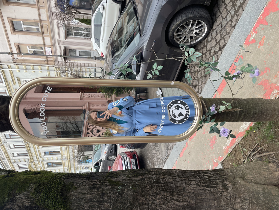 A vertical, oval, gold-framed mirror is affixed to a tree trunk on a street in Batumi, Georgia. The mirror reflects a young female individual with long blonde hair, wearing a light blue belted trench coat over a teal turtleneck, holding a dark-colored smartphone to capture a reflection. Sunglasses are positioned on her head. The mirror surface displays "YOU LOOK CUTE" in white text near the top, and "EVERY 6TH COFFEE" with a "GLOBAL COFFEE" globe logo near the bottom. The mirror is attached to the tree trunk with rope or twine, decorated with artificial purple roses and green foliage. To the left, a larger, moss-covered tree trunk is partially visible. The ground consists of dirt, sparse grass, and a concrete curb marked with red paint. The background depicts an urban street scene with parked vehicles: a red sedan (Georgian license plate 017 XX) is partially visible on the left, a dark gray Toyota Camry Hybrid is visible on the right, and a white SUV is parked further down the street. Multi-story buildings with light-colored, ornate facades line the cobblestone street. Overcast conditions are present.