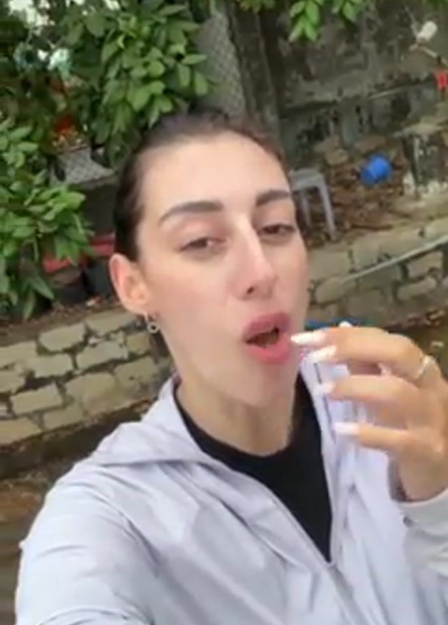 A woman is taking a selfie video outside. She has dark hair, fair skin, a light purple jacket, and is eating a sandwich. She looks at the camera and makes a “mwah” sound with her lips. The background includes plants, a wall, and a motorbike. A man with short, light hair and a plaid shirt walks behind her and eats something.