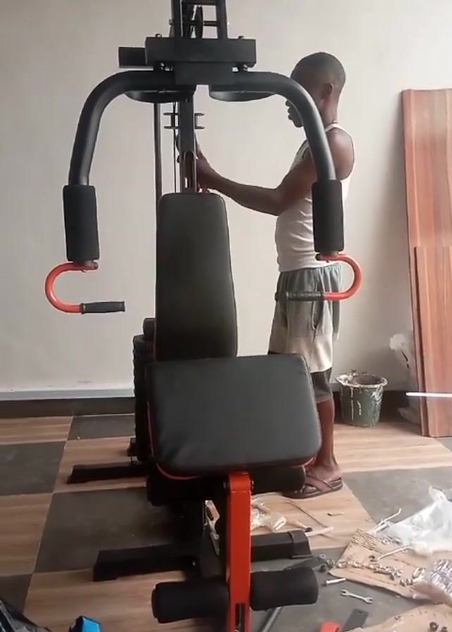 A man wearing a white tank top and gray shorts stands in a room and works on assembling a black and red multi-gym exercise machine