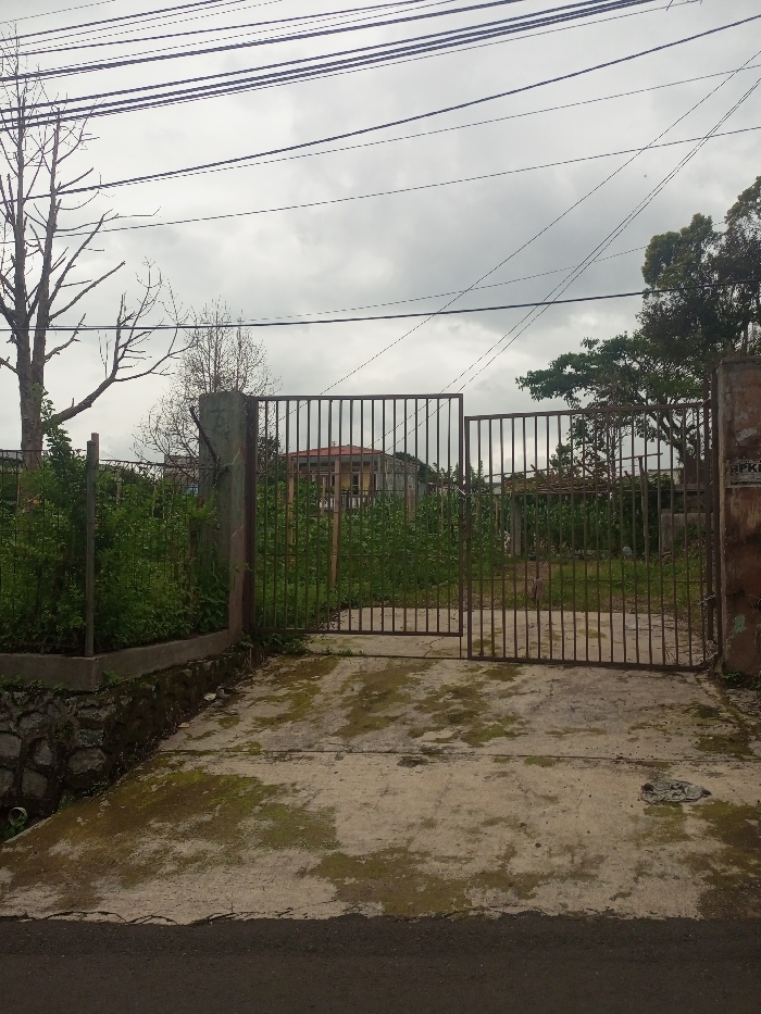 A gated entrance leads to an overgrown property under a cloudy sky