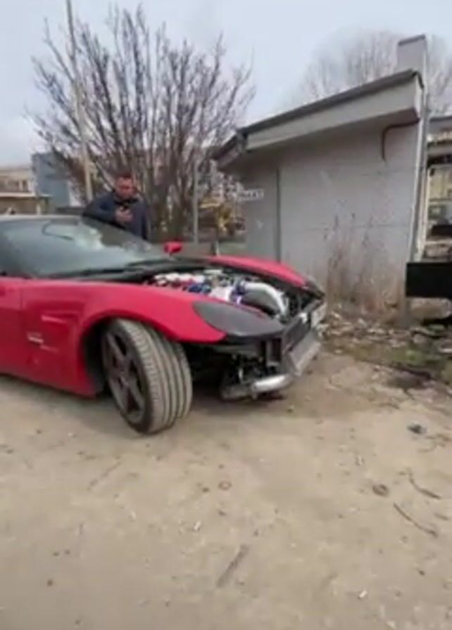 red Chevrolet Corvette parked on a dirt lot. The front end of the car is incomplete, exposing the engine compartment. A man stands by the car, looking at his phone. The engine makes a loud noise, with a distinct turbo sound. The surroundings appear to be a semi-industrial or commercial area, with small buildings and a lamp post visible.