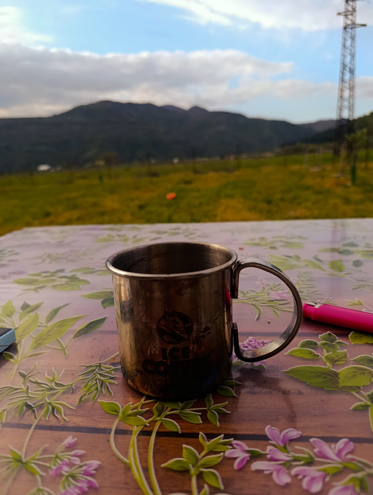The image depicts a metal coffee mug placed on a table with a floral design. A pink lighter is also visible on the table next to the mug. The background features a green field, mountains, and a metal utility tower under a partly cloudy sky. The location appears to be in a rural or elevated area, with a likely residential area in the city of Shiroko pole, Bulgaria, based on the mountain range terrain, though specific identifying features like city limits aren't clearly visible in the image. No people are visible.