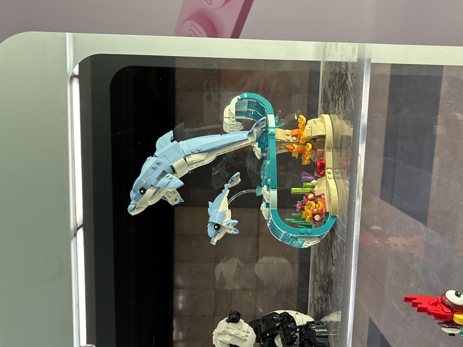 A Lego display features a light blue dolphin leaping above a smaller dolphin, both seemingly jumping through a wave constructed of light blue Lego bricks. The wave connects to a sandy structure with colorful coral formations. Below, partially visible, are other Lego creations in black, white, and red. The entire display is encased in a modern, clear case with light-colored framing.
