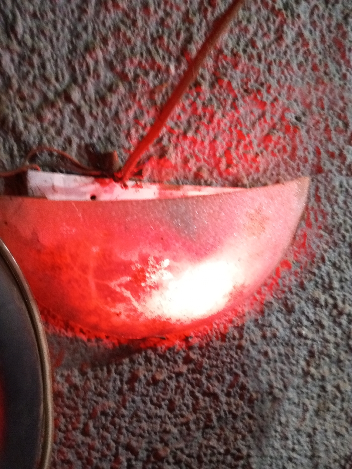 A partially illuminated, semi-circular object sits against a textured wall. The object is primarily white, emanating a bright white light from its center. It's saturated with a red hue, resembling paint or light. A thin, dark rod extends upward from the object's top edge, with electrical wiring visible nearby. A portion of a dark, circular object is visible in the lower left corner. The wall's texture appears rough and uneven, casting shadows that highlight the granular surface.
