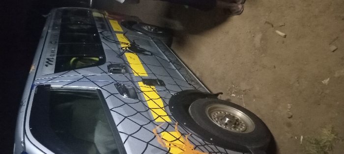 The image displays the left side of a silver-grey public transport minibus, commonly known as a matatu, at night in Kisumu, Kenya