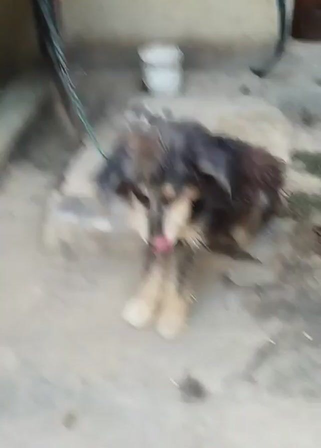 medium-sized, shaggy dog chained outside. The dog has predominantly black fur with tan markings on its legs and face. It is standing on a concrete step in what appears to be a courtyard or backyard, with light grey concrete paving the area. Behind the dog, there's a cream-colored wall, a metal object possibly a bicycle, a white bucket, and a concrete block with circular openings. A garden hose is also visible against the wall. The dog looks up briefly and then bows its head down. The dog is wearing a metal chain collar with a lead. The scene appears to be outdoors and during the day.