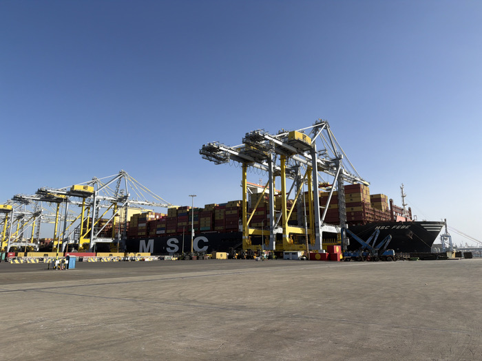 The image depicts an active container terminal at the Port of Ashdod, Israel, under a clear blue sky