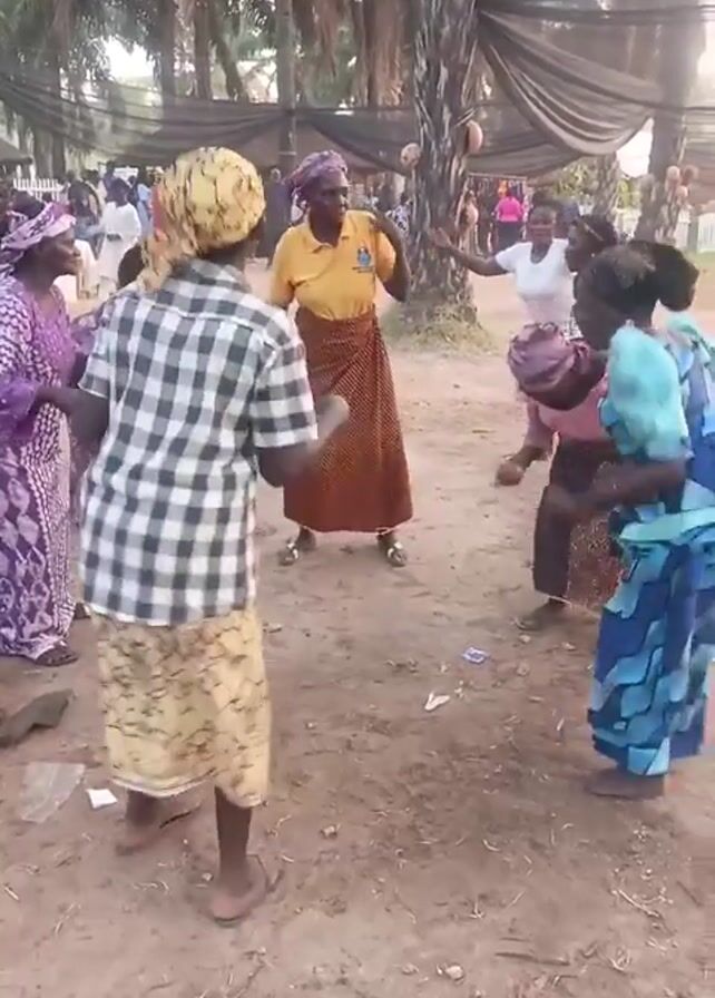 Several middle-aged African women are dancing in a circle in an outdoor gathering. They are dressed in casual clothing and colorful patterned skirts, and most have headwraps. The dance involves bending at the waist and moving their hands. Other people are standing around watching in the background. The setting appears to be a park or large yard with palm trees, with some decorations suggesting an event. The ground is dirt and strewn with small pieces of trash.